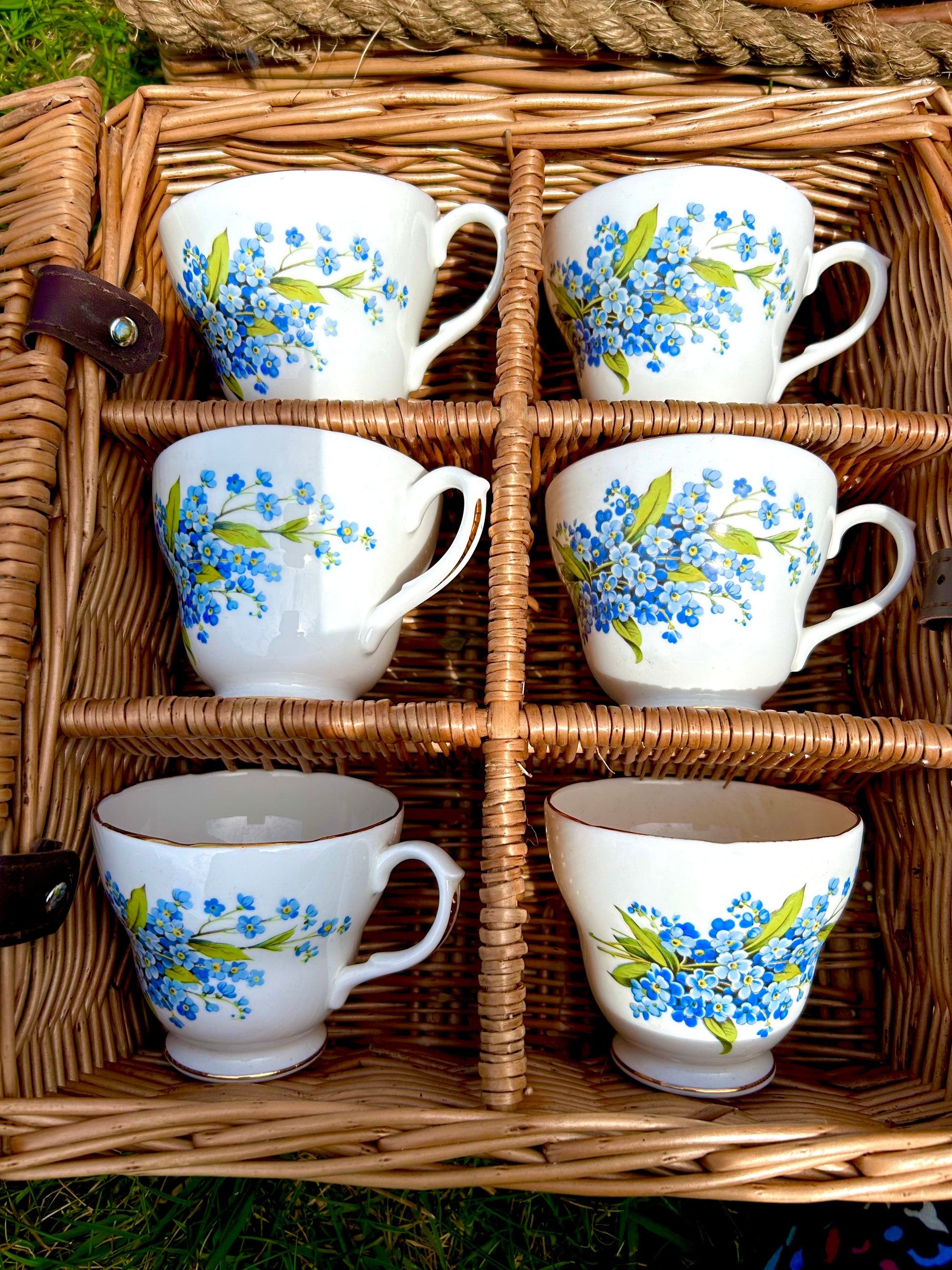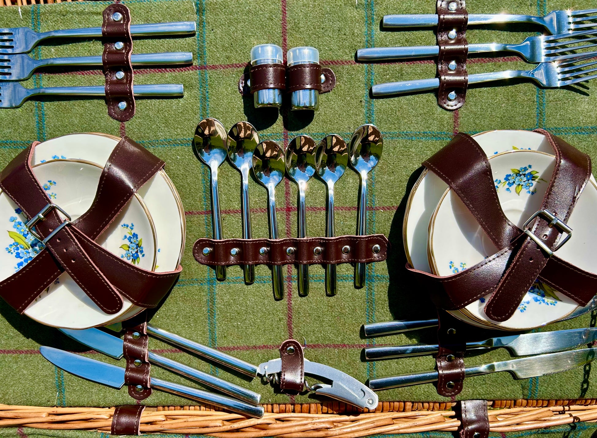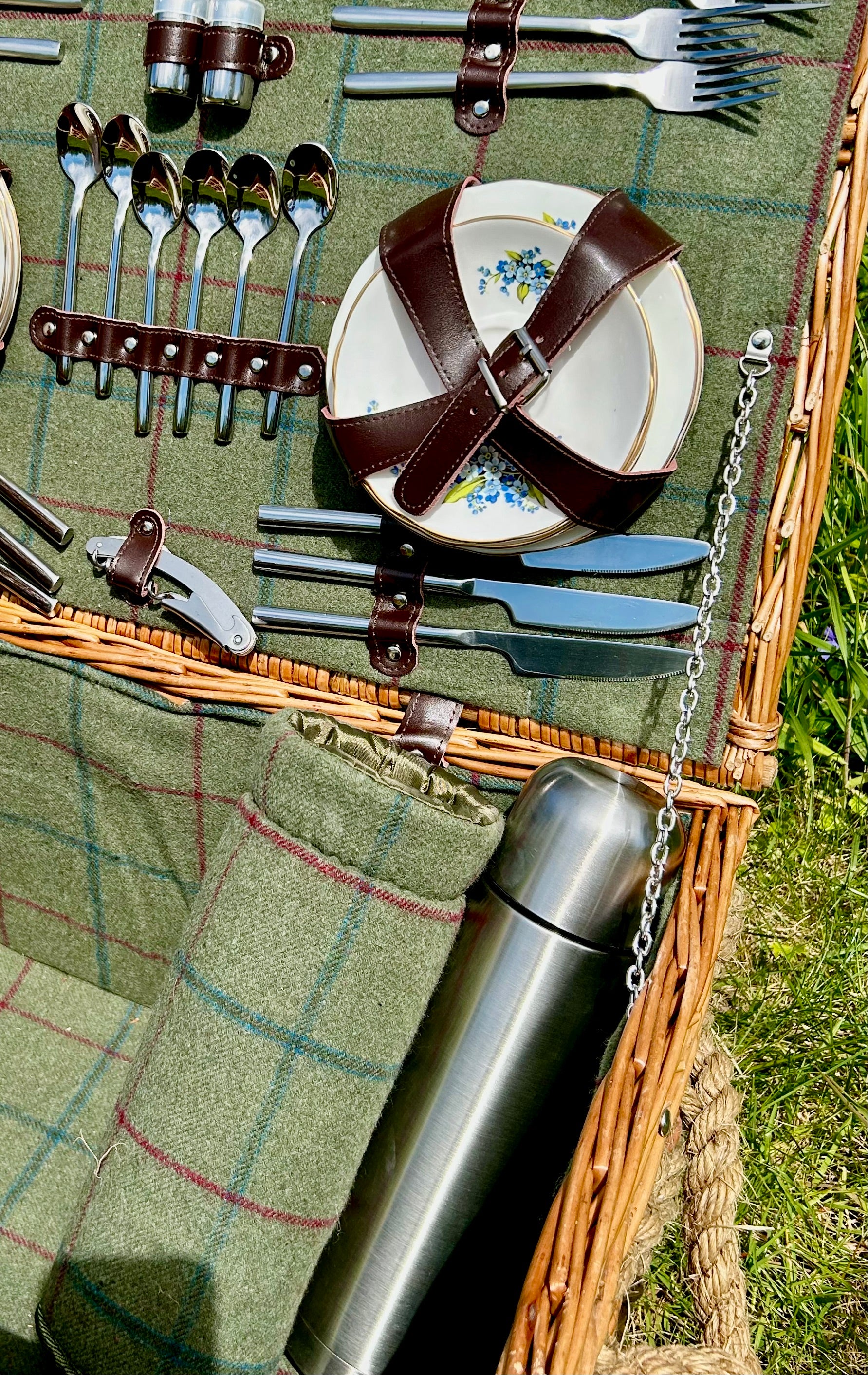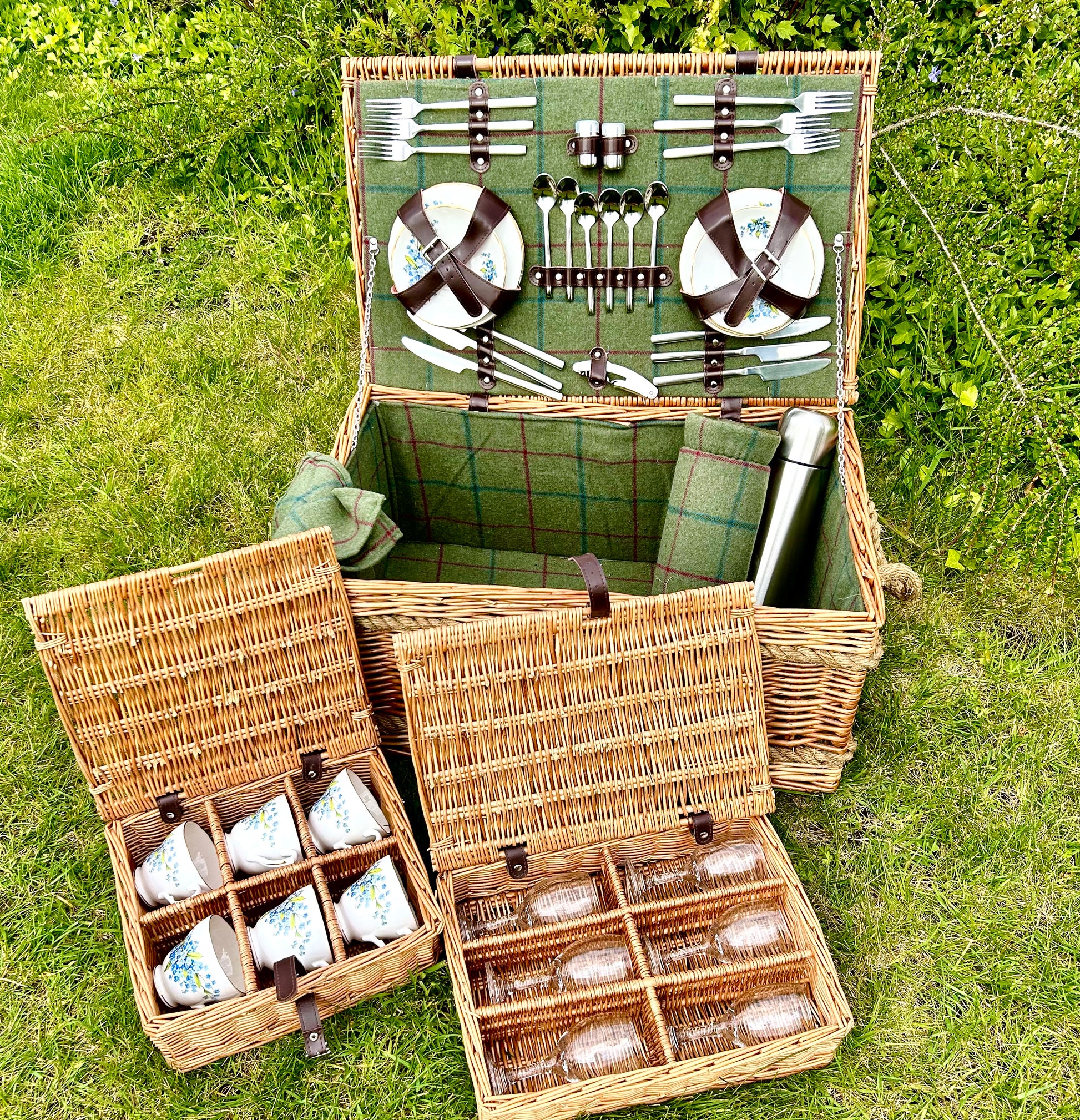 Wine glasses and Vintage china are packaged up in their own willow mini hampers, and once these are tucked inside the hamper, there is still plenty of room for a bottle or two and a generous picnic.